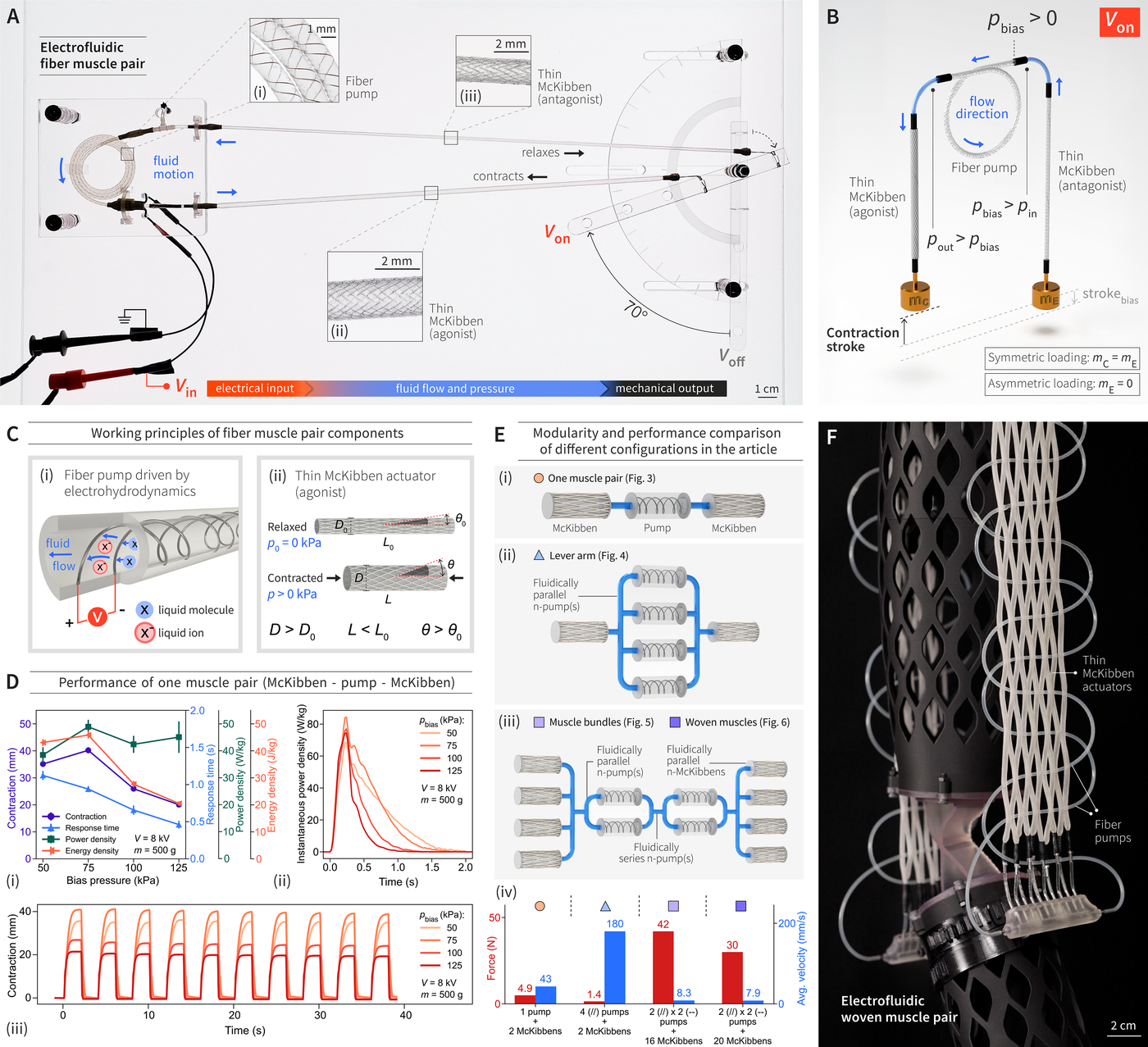 Electrofluidic Fiber Muscles are a new class of artificial muscle fibers for robots and wearables. By integrating charge-injection electrohydrodynamic (EHD) fiber pumps directly into the muscle system, EFMs operate silently and untethered, eliminating bulky external equipment such as pumps, compressors, and tubing that has long limited the portability and practical use of fluidic soft robots. This work was developed in collaboration with Politecnico di Bari, Italy, and co-funded by European Research Council grant.
