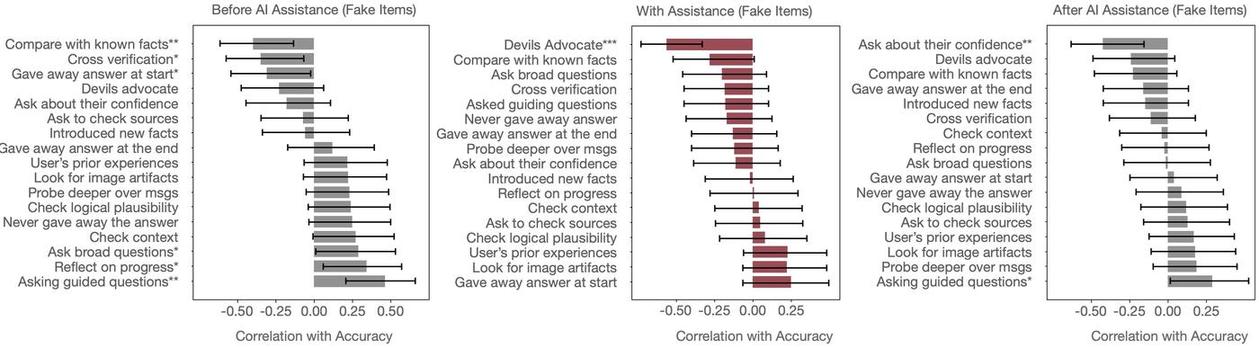 By contrast, interactions that were associated with improvements in skill were ones in which the AI slowed down and guided the user through the reasoning process. Strategies such as AI asking focused questions, probing the user’s thinking, and walking step by step through how to assess a news item were linked to stronger unassisted performance afterward.