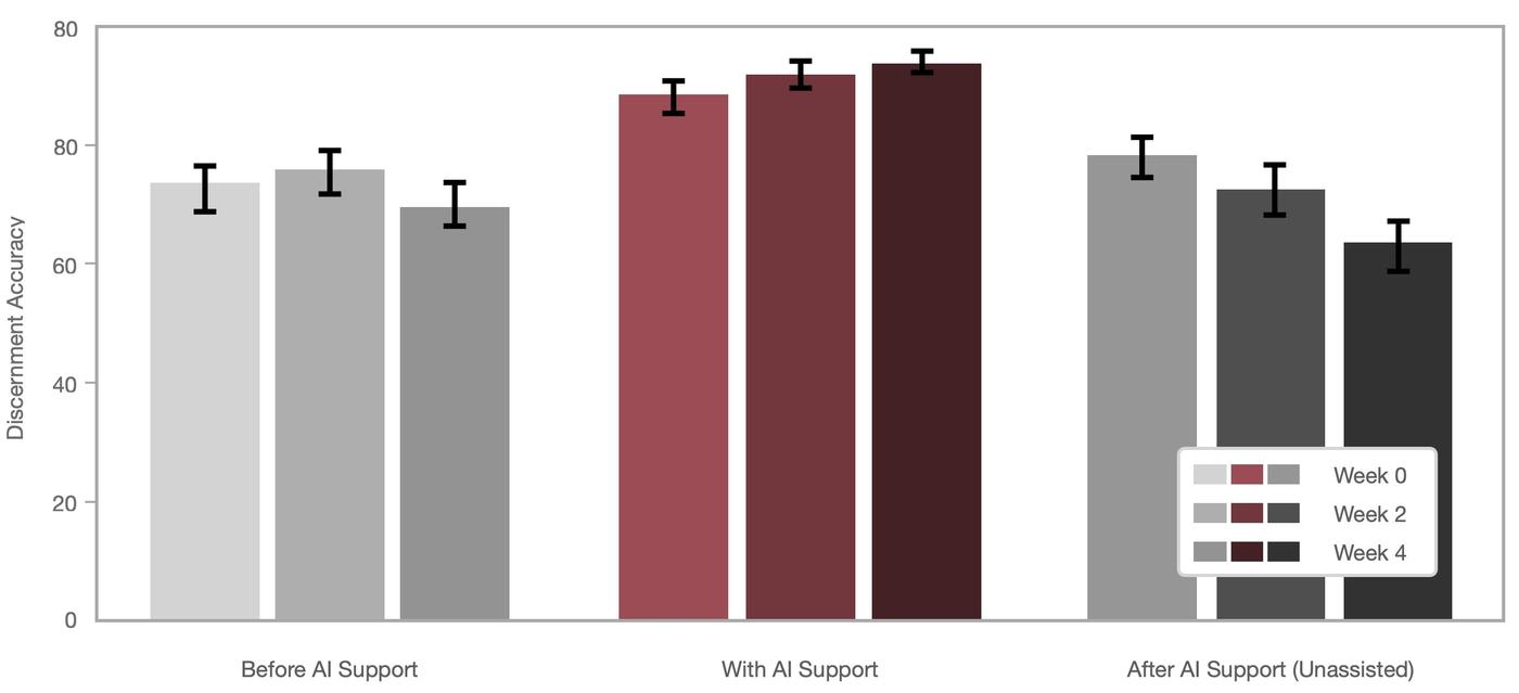 These results suggest an important distinction between AI use that increases performance in the moment versus AI use that leads to improvements in discerning abilities. AI support improved the former, but it did not reliably produce the latter.