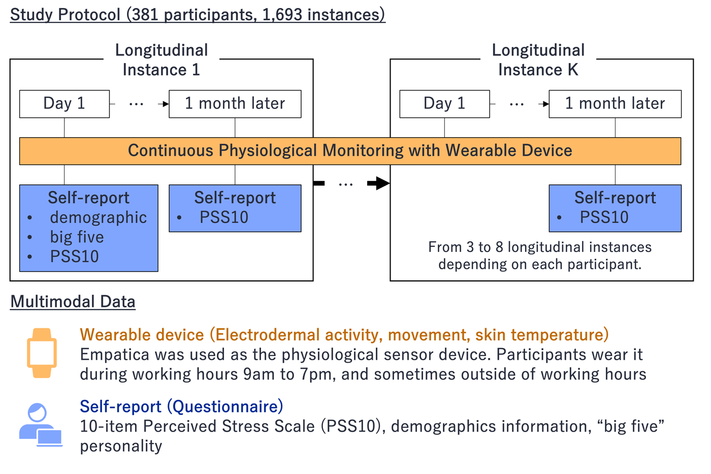 As part of the study, participants wear wrist-mounted sensors that continuously measure electrodermal activity (EDA), a physiological signal associated with sweating and sympathetic nervous system activity. These data are being examined alongside periodic self-reported stress assessments using established survey instruments. The study includes data from employees at Japanese companies and spans both working and non-working hours, resulting in one of the largest longitudinal datasets assembled to date for this type of research.