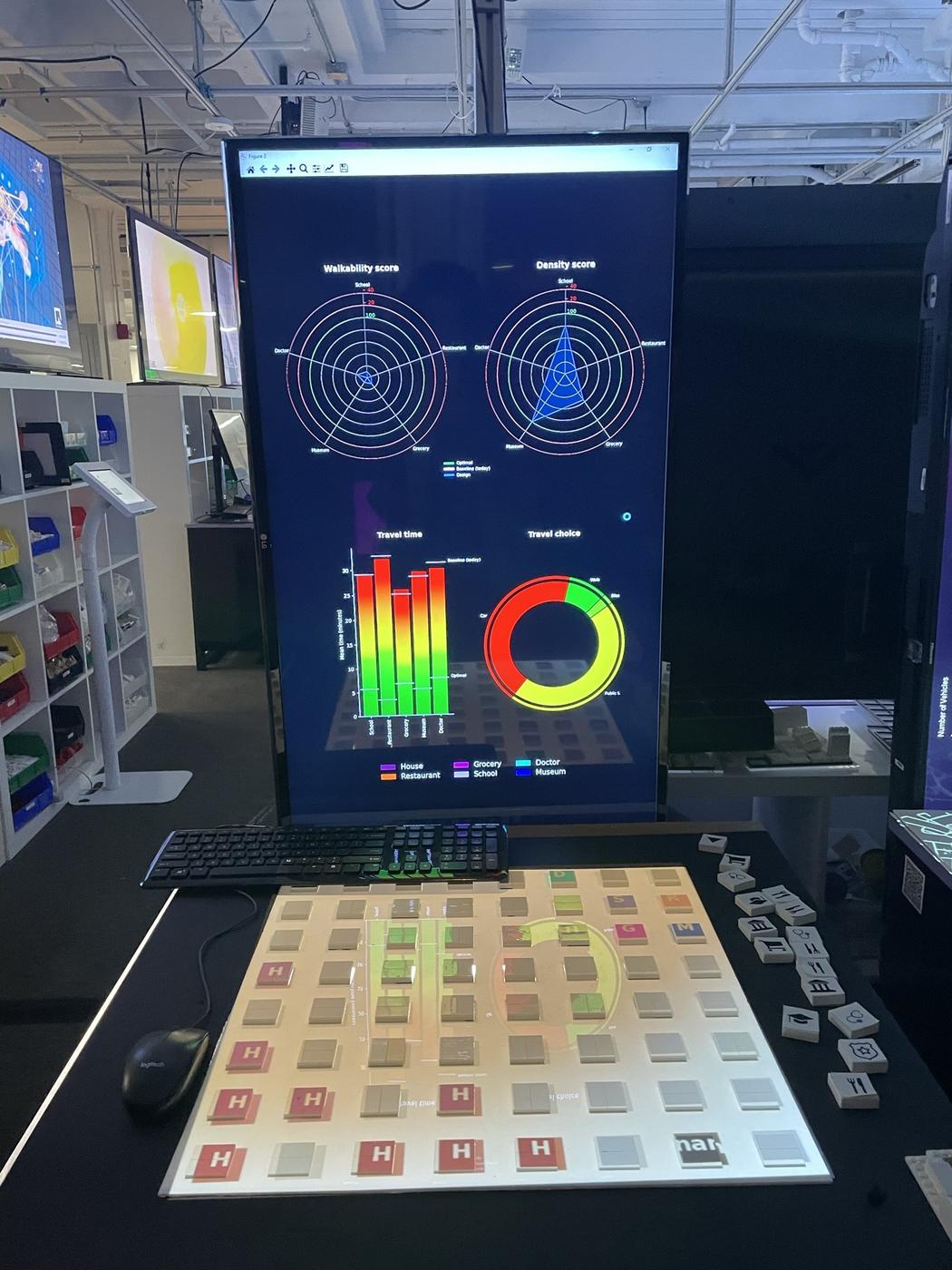 To make these insights accessible, the project introduces a tangible urban simulation interface, where users can physically rearrange amenities on a tabletop grid and instantly observe the impact on urban performance indicators.