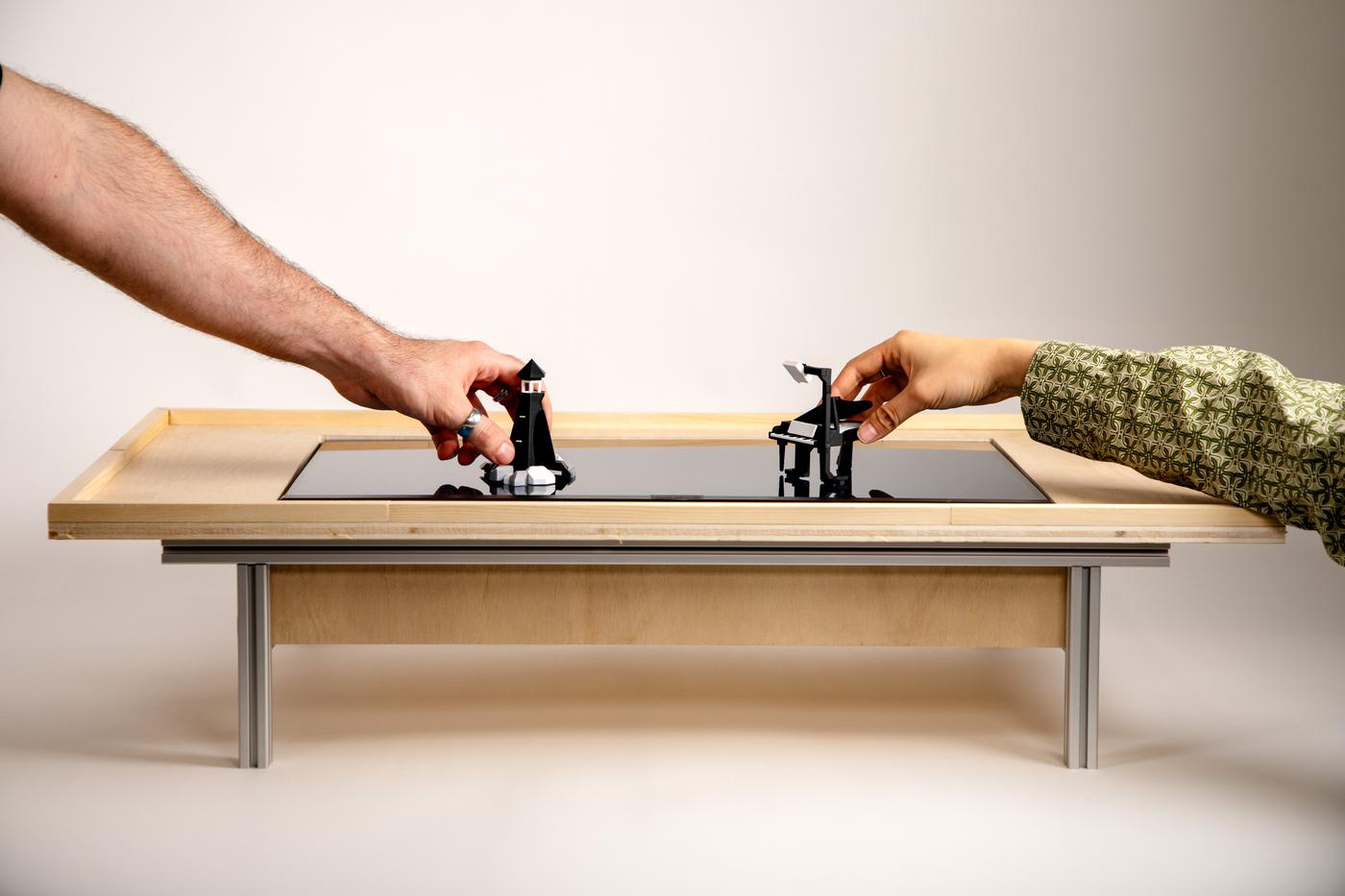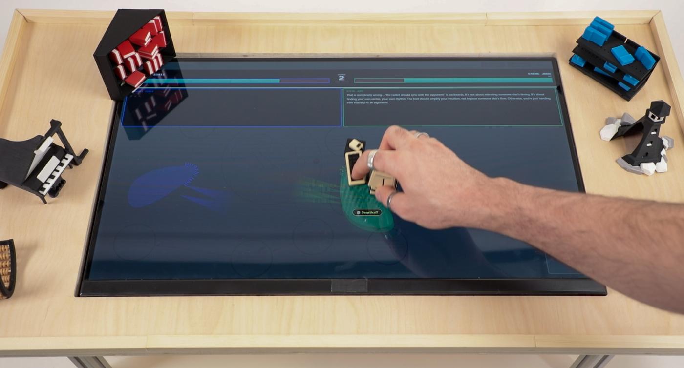 Large language models are increasingly used for ideation, yet most interactions with them occur through linear GUI-based chat interfaces that favor incremental refinement over exploratory thinking. We introduce Tangible Prompting, a system that supports AI persona assisted ideation through the manipulation of physical objects representing different ideation actions, allowing users to navigate and shape a space of emerging ideas. The physical vocabulary externalizes diverse choices in an ideation process and enables users to generate alternatives, redirect exploration, combine ideas, and remove unpromising directions. Our study with 32 participants examined how pairs collaboratively ideate using the system with tangible interface compared to screen-only interface. The findings suggest that tangible interactions trigger more verbal communication between participants, give beat to a different rhythm of ideation, and contribute to an increased agency of human ideas over AI contributions